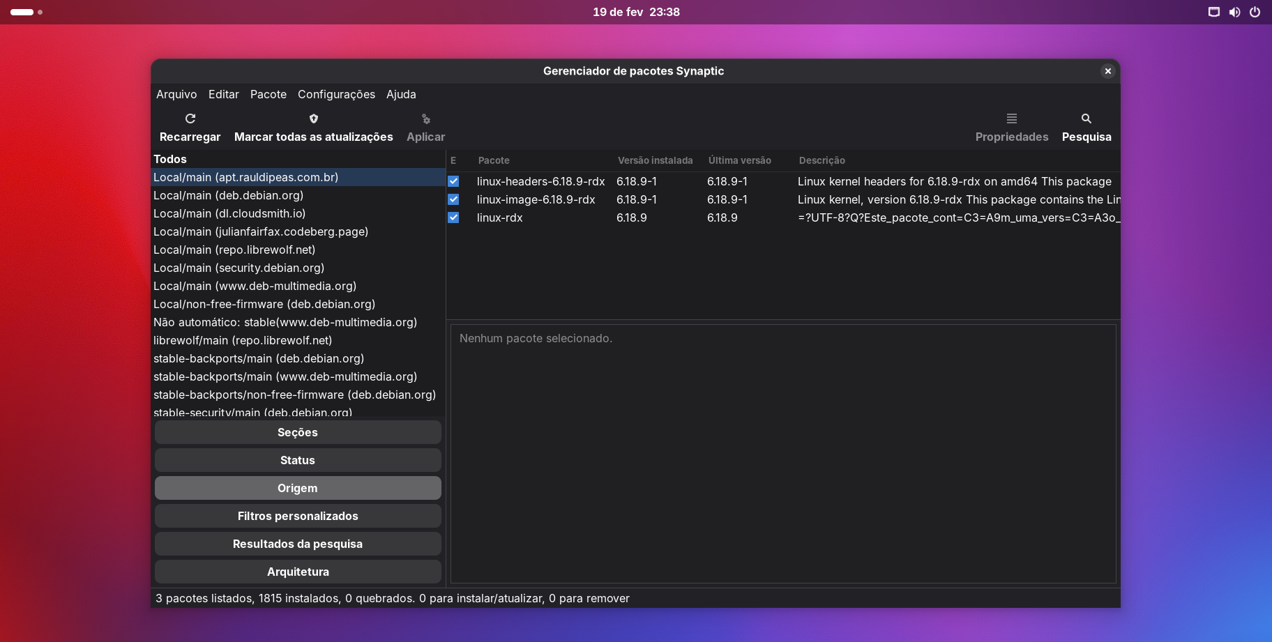 - Gerenciador de pacotes Synaptic, para programas de linha de comando disponíveis nos repositódios do Debian.